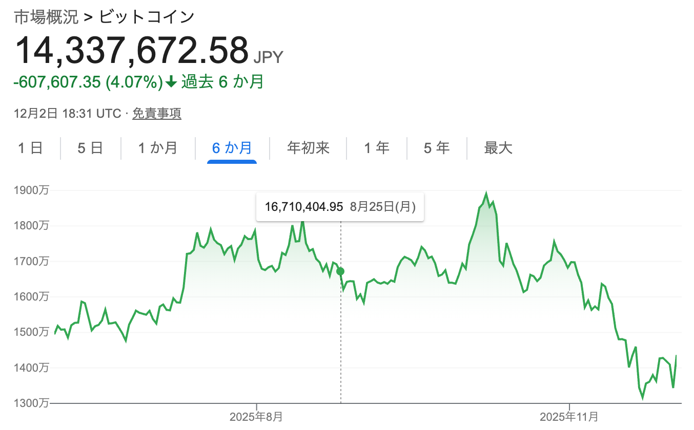 11月20日時点でビットコインは約1296万円で取引されており、10月6日に記録した史上最高値約1890万円から31%も下落した。年初来では5%以上のマイナスとなり、2025年は赤字でスタートしている状況だ。